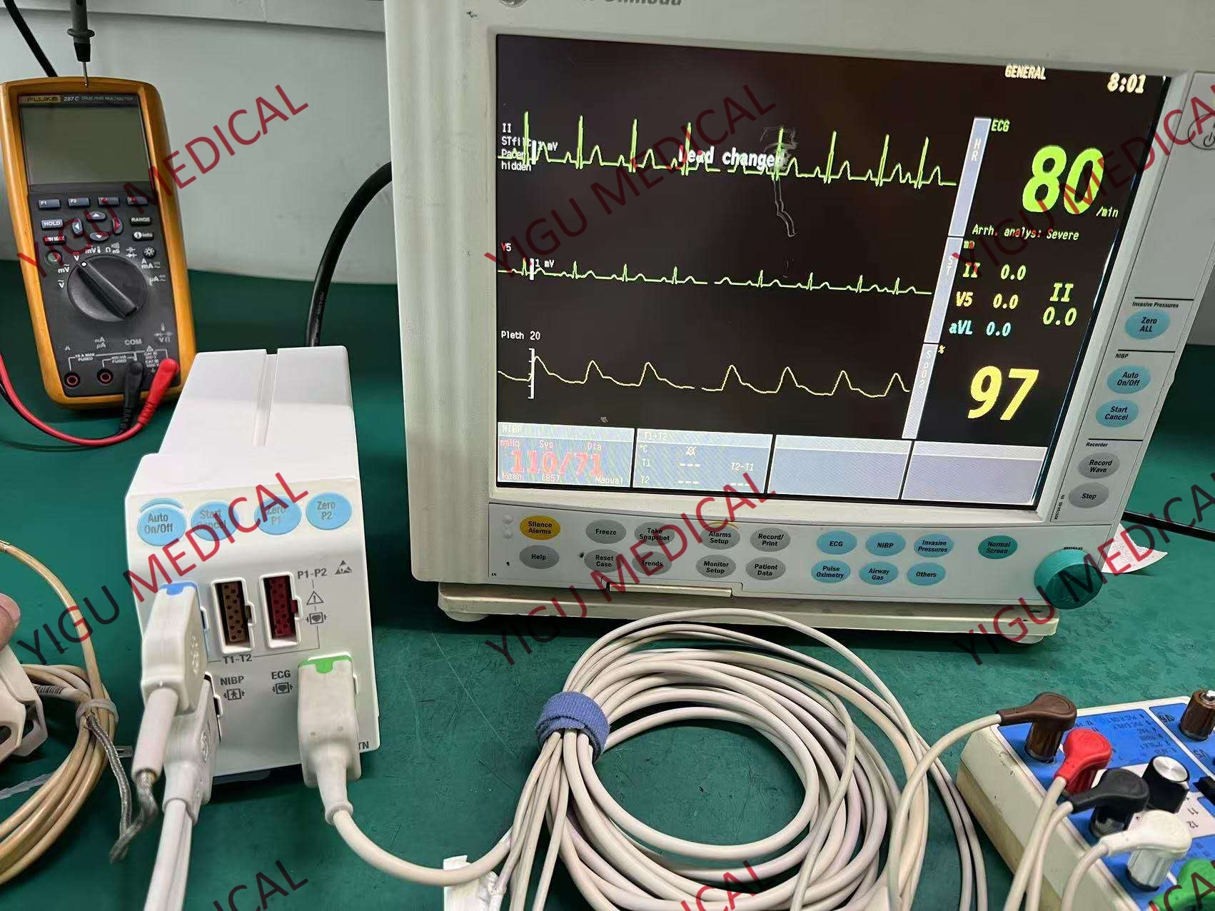 - Μπορεί να μετρήσει ένα ευρύ φάσμα φυσιολογικών παραμέτρων.που αντικατοπτρίζει την ηλεκτρική δραστηριότητα της καρδιάς και βοηθά στην ανίχνευση καρδιακών προβλημάτων όπως αρρυθμίες.Η μη επεμβατική μέτρηση της αρτηριακής πίεσης (NIBP) είναι διαθέσιμη, παρέχοντας πληροφορίες για τη συστολική και διαστολική αρτηριακή πίεση για την αξιολόγηση της κυκλοφοριακής κατάστασης του ασθενούς.Μπορεί επίσης να μετρήσει μέχρι έξι επεμβατικά κανάλια αρτηριακής πίεσης για βαθύτερη αιμοδυναμική παρακολούθηση σε ορισμένες περιπτώσειςΗ θερμοκρασία, η κορεσμό του οξυγόνου (SpO2) και ο ρυθμός αναπνοής είναι άλλες βασικές παραμέτρους που μπορεί να παρακολουθήσει.που είναι χρήσιμο σε σενάρια αναισθησίας και αναπνευστικής φροντίδας για την παρακολούθηση των επιπέδων των σχετικών αερίων ή παράγοντων.